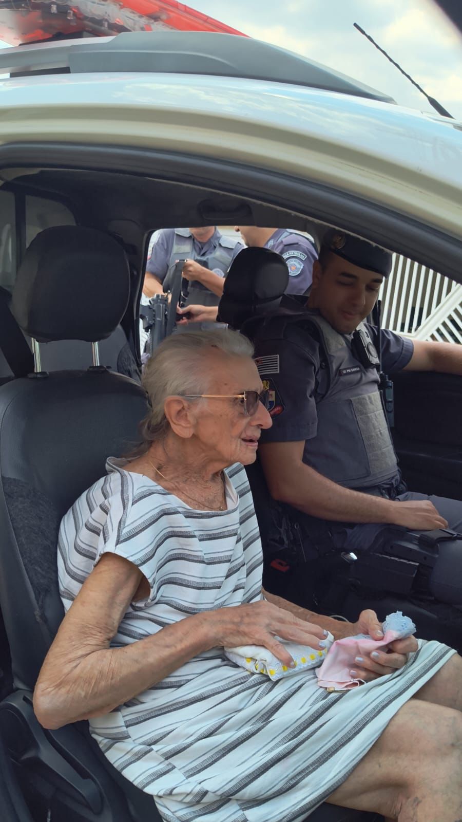 Durante a visita, dona Teresa conheceu a rotina da equipe, viu de perto os equipamentos usados no dia a dia e, com grande emoção, deu uma volta na viatura. O momento especial ficará para sempre em sua memória.