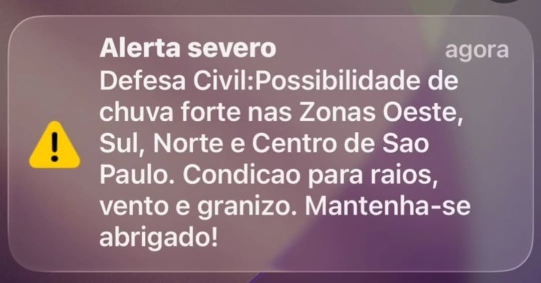 Apesar de o aviso citar apenas a capital, ele foi enviado também a moradores da região do ABC, o que indica que as condições climáticas podem atingir cidades vizinhas.