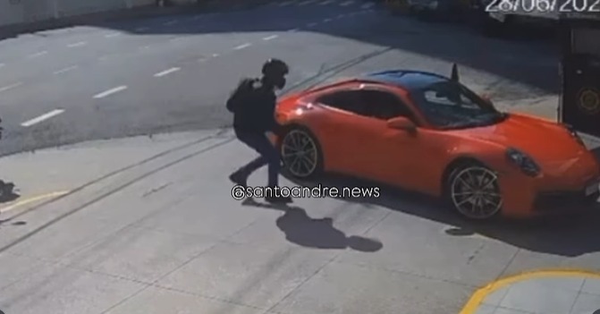 Na tarde deste sábado (28), por volta das 13h30, um motorista de um Porsche vermelho reagiu a uma tentativa de assalto na Vila Gilda, em Santo André. Segundo informações da Polícia Militar e câmeras de segurança, ele foi abordado por dois homens em uma motocicleta enquanto chegava a um prédio na região, acompanhado da filha.