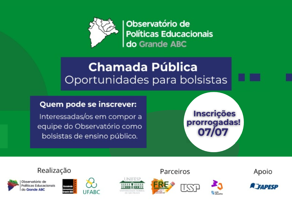 O Observatório de Políticas Educacionais do Grande ABC prorrogou, até 7 de julho (segunda-feira) o processo seletivo que vai bolsas para professores em exercício nas redes públicas municipais e estaduais que atuam na região e para pesquisadores. Os selecionados irão integrar a equipe do Observatório e participar da execução das atividades relacionadas ao Diagnóstico da Educação no Grande ABC, preparatório à construção dos planos decenais de educação.
