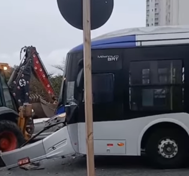 Um ônibus articulado da linha 11, operado pela BR7 Mobilidade, se envolveu em um acidente com uma retroescavadeira na tarde desta terça-feira (5), na rotatória da Avenida Aldino Pinotti, em São Bernardo do Campo.
