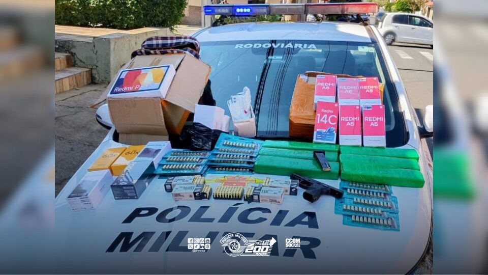 Durante a fiscalização, os policiais vistoriaram o compartimento de carga, utilizado para envio de encomendas, onde foram encontrados seis pacotes de maconha, totalizando 4,7 kg, além de uma pistola calibre .40 com numeração raspada, um carregador com três munições, 250 munições calibre .40, 250 munições calibre 9 mm, celulares sem nota fiscal e cigarros eletrônicos.