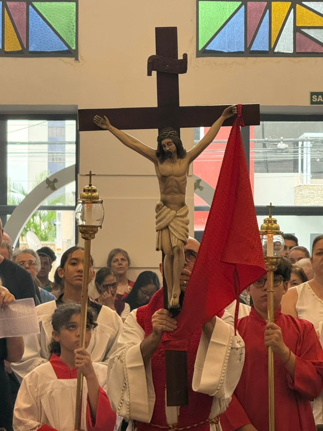 A liturgia, presidida pelo padre Romeu Izidório, integra o Tríduo Pascal e recorda a paixão e morte de Jesus Cristo, com proclamação do Evangelho, adoração da Santa Cruz e distribuição da comunhão.