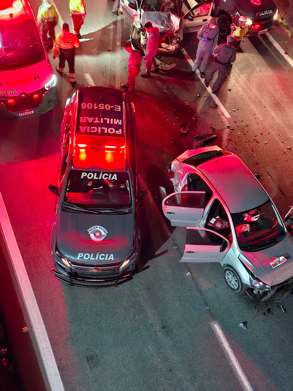 Dois policiais militares ficaram feridos, sendo um deles atingido na perna. O condutor do outro veículo também ficou ferido. Todos foram socorridos e encaminhados para hospitais da região, onde seguem sob cuidados médicos.