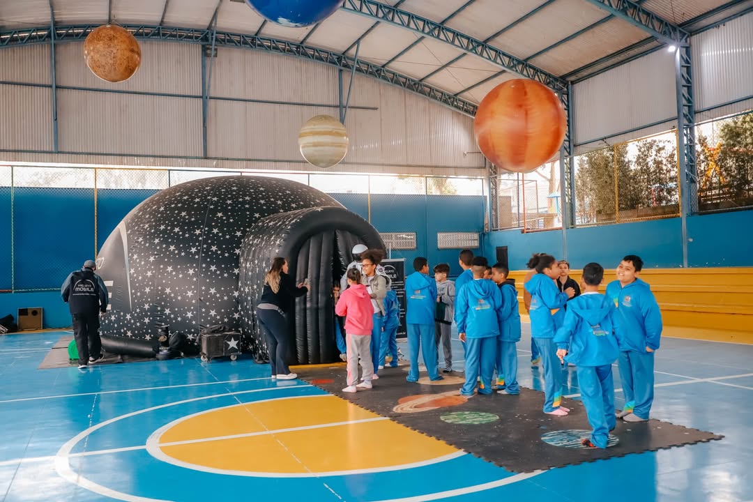 A estrutura inflável, montada pelo Projeto Móbile, simula o céu noturno e apresenta imagens de estrelas, planetas e galáxias. Ao sair da sessão, Maria Clara, de 10 anos, aluna do 4º ano, contou: “Achei muito incrível a sensação lá dentro, porque a gente consegue saber até a idade das estrelas. Quando a gente olha para o Céu à noite, lá estão as estrelinhas e os planetas, tudo pequenininho, mas aqui a gente vê tudo bem de perto, como eu sempre quis. Por isso, é demais, porque a gente consegue ver até o Sol de perto”.