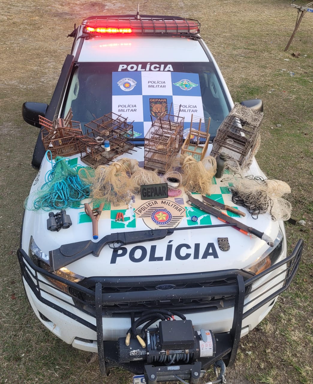 Na sequência, os agentes vistoriaram um rancho de madeira e encontraram cinco tarrafas, nove alçapões para captura de aves, uma batedeira de aves, uma carabina de pressão calibre 5.5, além de projéteis, facas, facão, estilingue, espinhal com 20 anzóis, binóculo, cantil e três cartuchos calibre 36 já deflagrados. O local foi desmontado por estar em área de servidão da Empresa Metropolitana de Águas e Energia (EMAE), em meio à mata nativa.