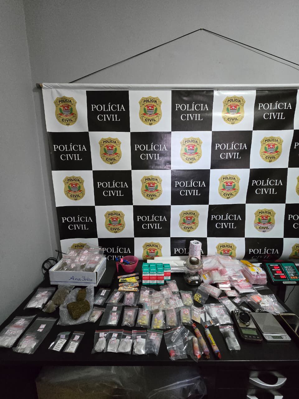 No imóvel alvo da operação, localizado na zona leste de São Paulo, os policiais encontraram cocaína, LSD, ecstasy, “ice”, “dry”, maconha, MDMA, cogumelos e balinhas de goma recheadas com LSD, semelhantes a doces infantis, além de apetrechos usados no preparo e distribuição dos entorpecentes.