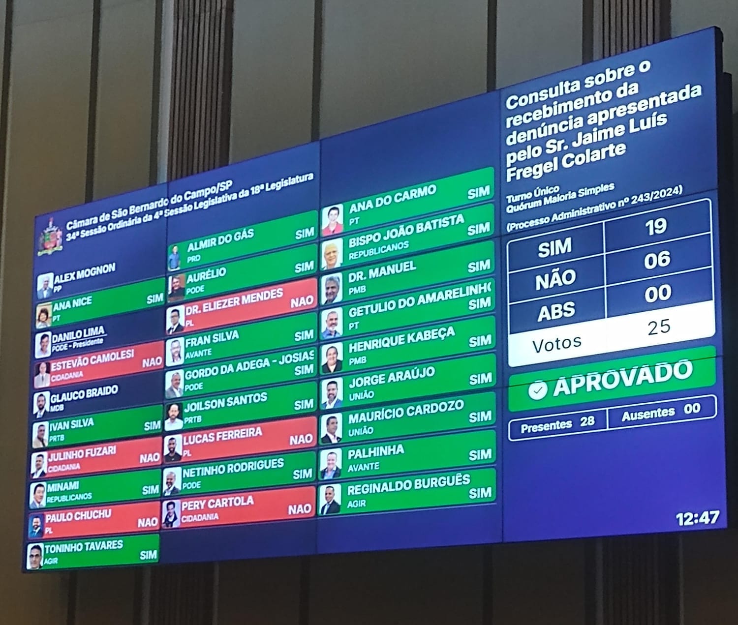 O requerimento foi aprovado com 19 votos a favor e 6 contrários, sendo que o presidente da Câmara, Danilo Lima, não votou. Votaram “SIM” pela abertura do processo os vereadores Ana Nice, Ana do Carmo, Bispo João Batista, Almir do Gás, Aurélio, Dr. Manuel, Getulio do Amarelinho, Fran Silva, Gordo da Adega – Josias, Joilson Santos, Jorge Araújo, Henrique Kabeça, Maurício Cardozo, Palhinha, Reginaldo Burguês, Ivan Silva, Minami, Netinho e Toninho Tavares.