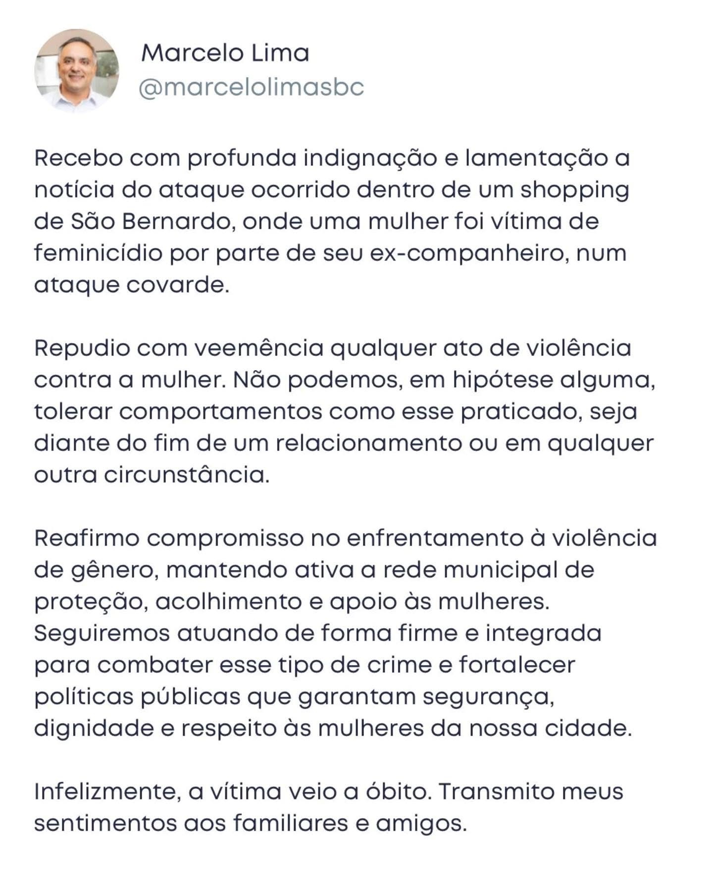 “Recebo com profunda indignação e lamentação a notícia do ataque ocorrido dentro de um shopping de São Bernardo, onde uma mulher foi vítima de feminicídio”, diz um trecho da publicação.