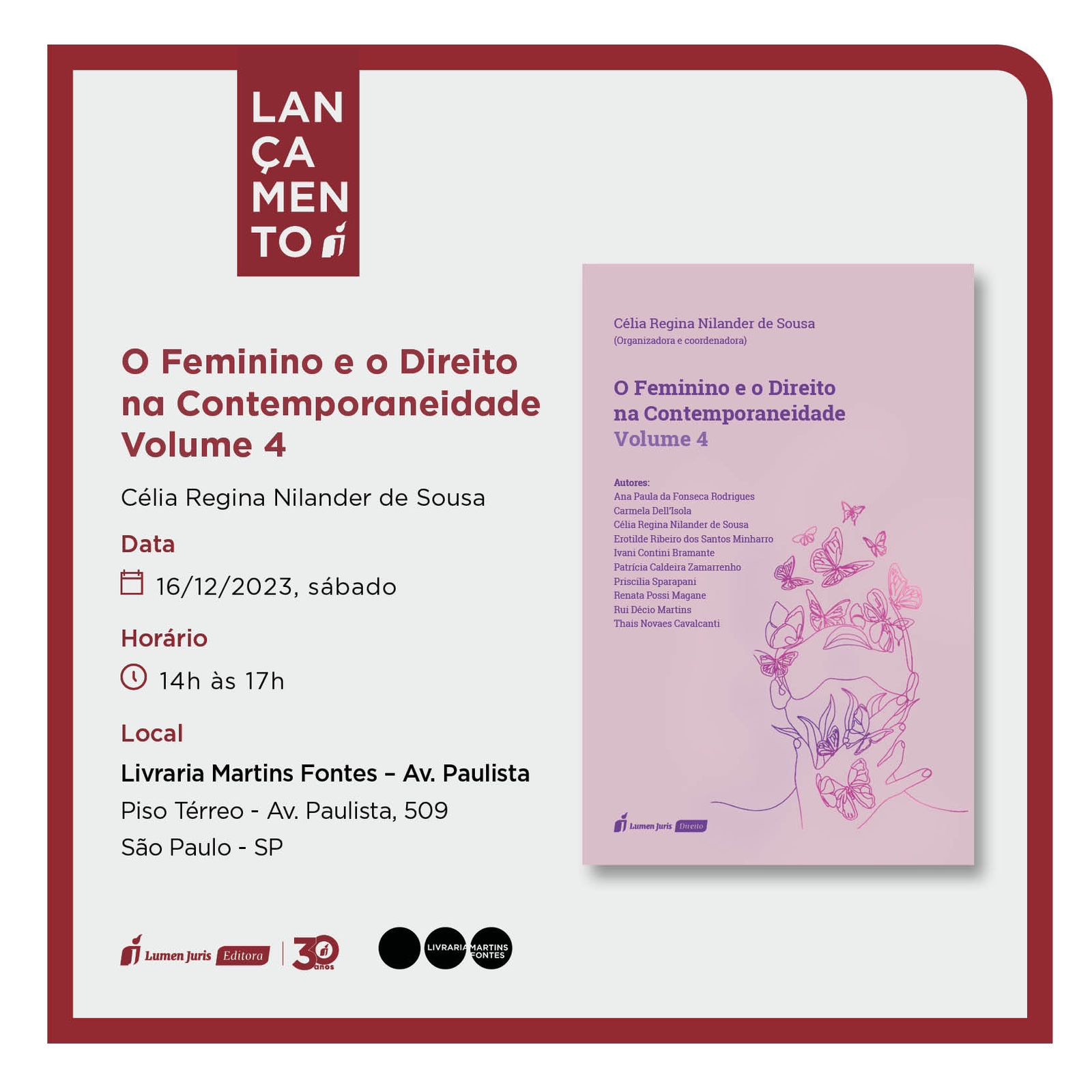 A Livraria Martins Fontes será palco, no dia 16 de dezembro, do aguardado lançamento do quarto volume do livro “O Feminino e o Direito na Contemporaneidade”, coordenado pela professora da Direito São Bernardo, Dra. Célia Regina Nilander de Sousa. Em colaboração com outras destacadas docentes da Faculdade de Direito de São Bernardo do Campo (FDSBC), a obra, editada pela Lumen Júris, foca nos desafios e avanços nos direitos das mulheres.