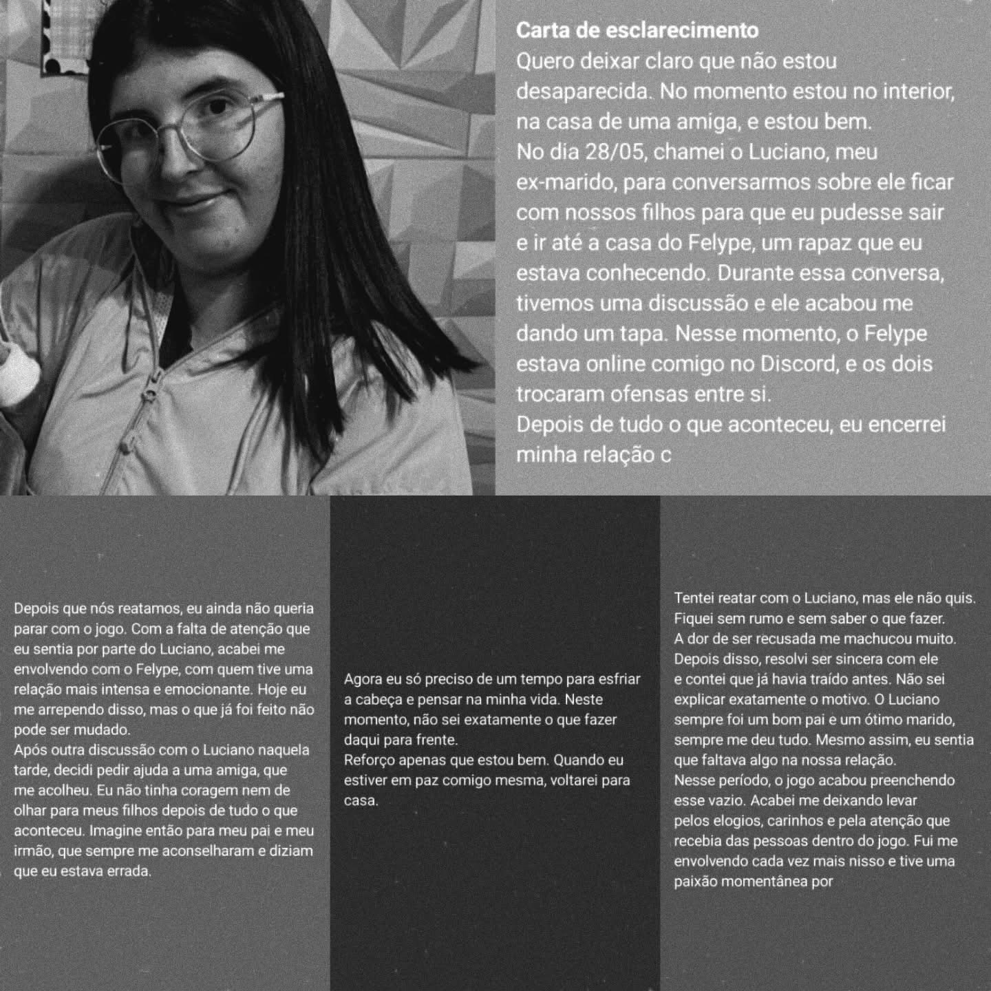 No texto, a pessoa afirmava que não estava desaparecida e que estaria no interior, na casa de uma amiga. A mensagem também trazia relatos pessoais sobre o relacionamento com o companheiro e mencionava conflitos envolvendo um homem chamado Felype.