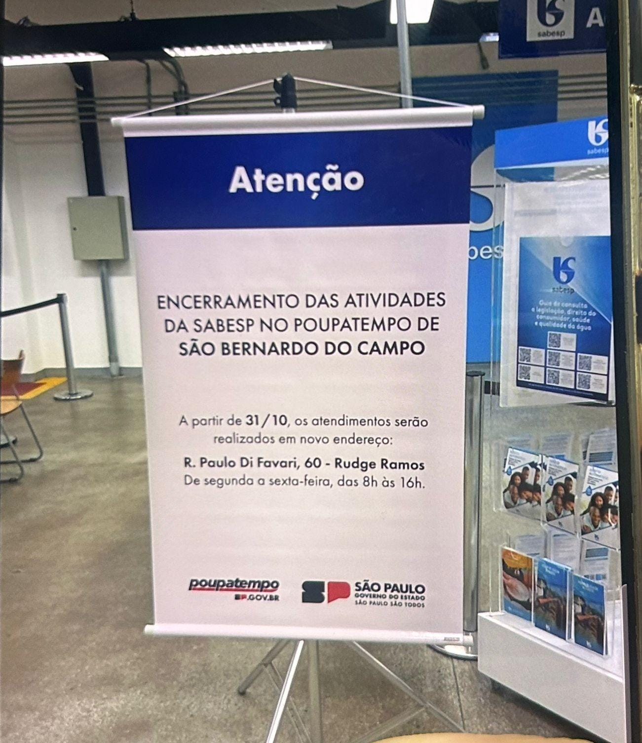 A Sabesp vai encerrar o atendimento presencial no Poupatempo de São Bernardo do Campo no dia 31 de outubro. A partir de novembro, os serviços da companhia serão prestados em um novo endereço, no bairro Rudge Ramos.