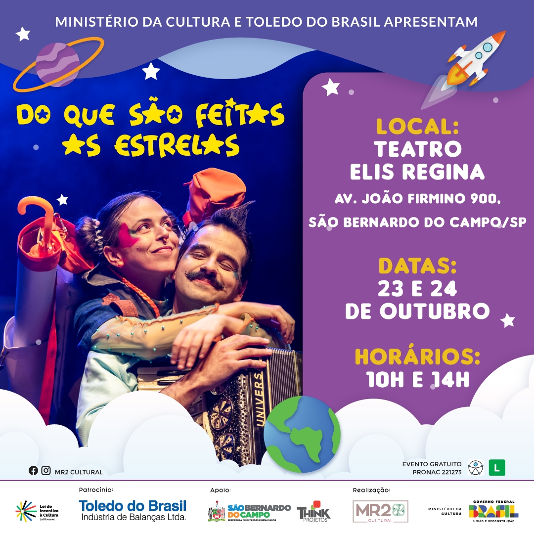 A peça “Do que são feitas as estrelas?” é realizada pelo Ministério da Cultura do Governo Federal e contempla as cidades paulistas de São Bernardo do Campo e São Joaquim da Barra, por meio da Lei Incentivo à Cultura, e é realizada pela MR2 Cultural. Em São Bernardo do Campo, recebe o apoio da Prefeitura Municipal e o patrocínio da Toledo do Brasil. “Além de incentivar a cultura em nossa cidade, a ação é de grande importância para que os nossos colaboradores reflitam sobre questões sociais que impactam diretamente suas relações pessoais e corporativas de uma maneira leve e divertida” cita Renan Piza, analista de comunicação da Toledo do Brasil e responsável pelas ações de responsabilidade social da empresa.