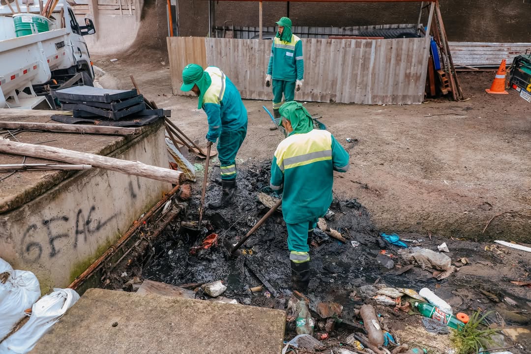 A operação incluiu a retirada de lixo e terra acumulados em encostas e galerias, com o objetivo de melhorar o escoamento da água e evitar pontos de alagamento e risco de deslizamentos. A ação foi executada por equipes da Defesa Civil e da Secretaria de Serviços Urbanos.