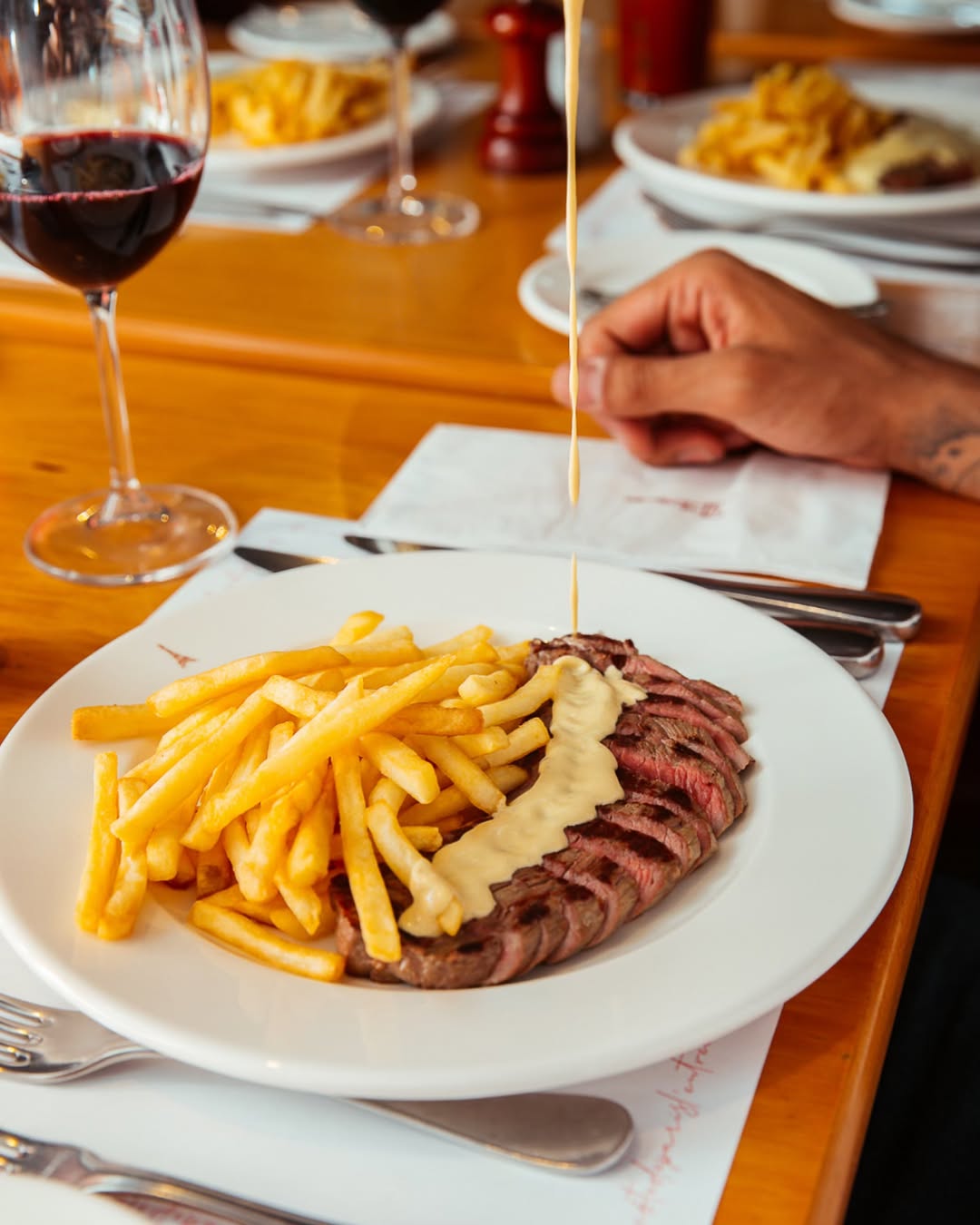 O cardápio traz o clássico entrecôte com molho secreto acompanhado de batatas fritas crocantes, além de entradas como steak tartare, queijo brie, saladas e burrata de búfala. Entre as sobremesas estão os tradicionais crème caramel (pudim) e o mille feuilles Eiffel (mil-folhas).