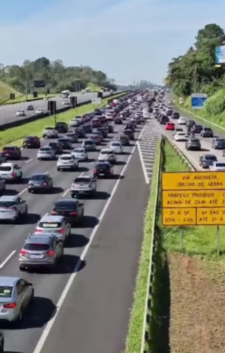 A operação 5×3 está em vigor, com cinco faixas para a descida e três para a subida da serra, facilitando o fluxo de veículos rumo à Baixada Santista.